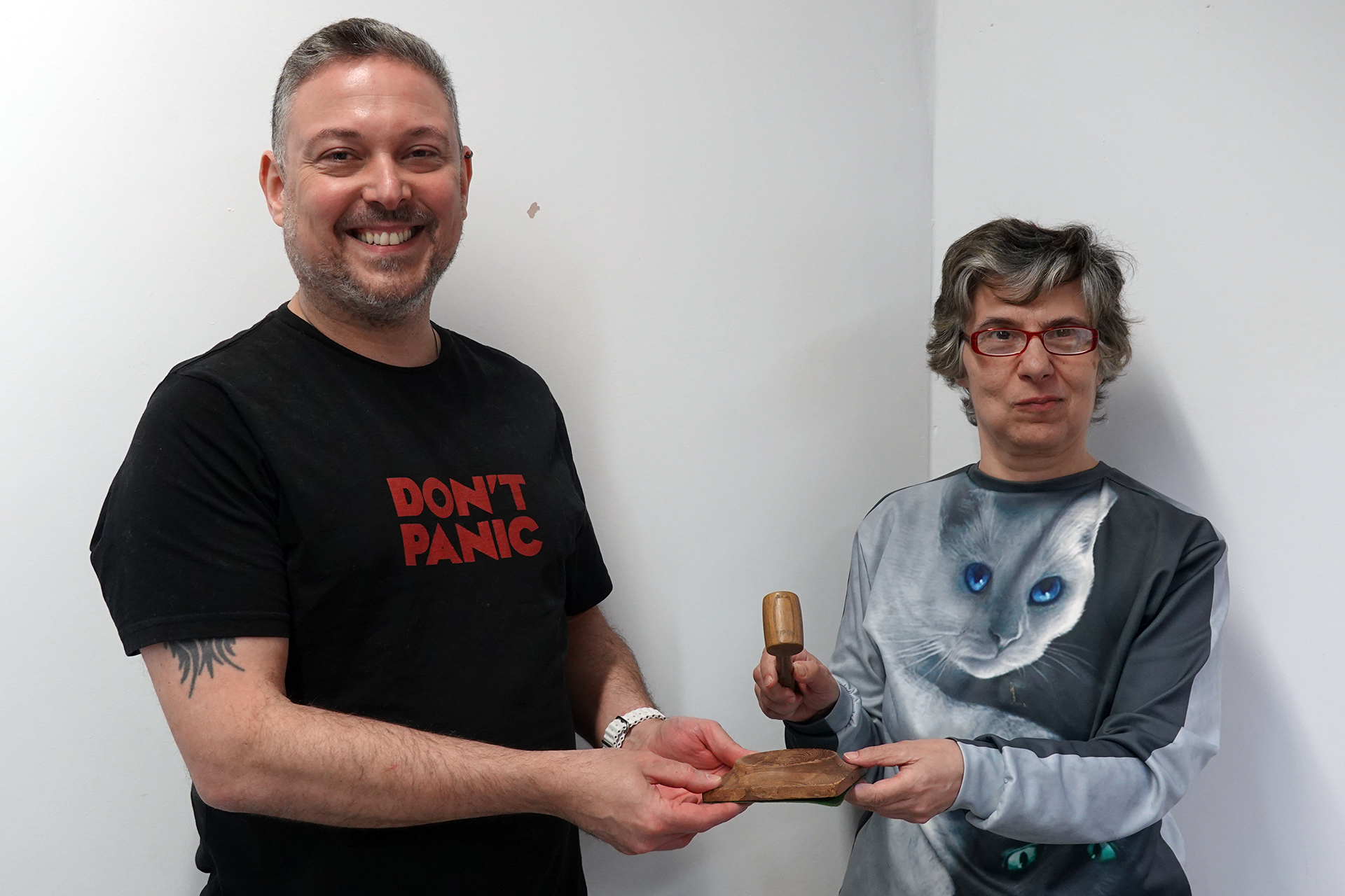 Selso, the newly elected Chair, receives the gavel from Miriam, the outgoing Chair.